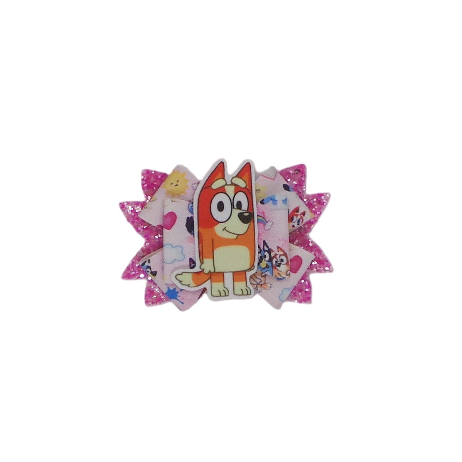 A happy orange heeler embellishment attached to chunky glitter and printed faux leather sheets.