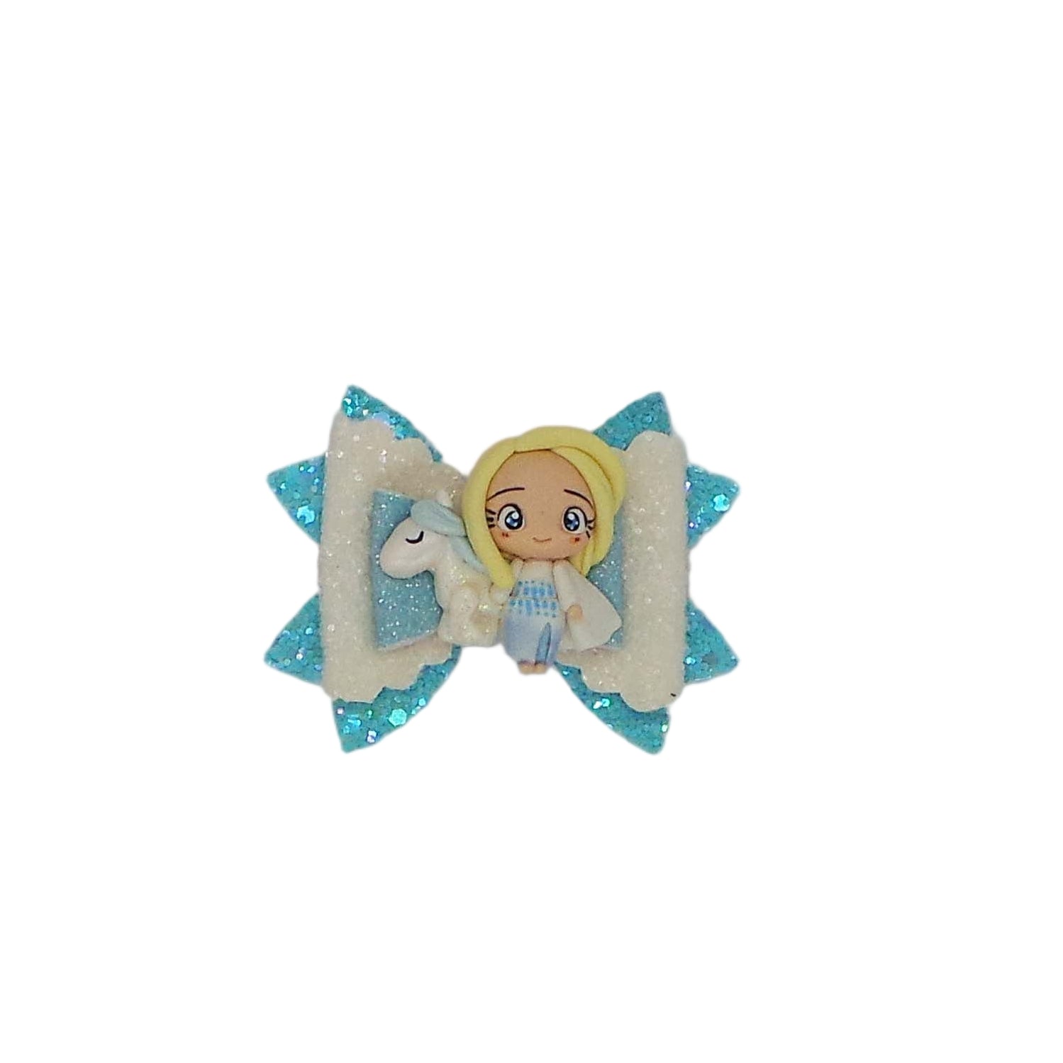 An ice queen with horse clay attached to chunky glitter and printed faux leather sheets.