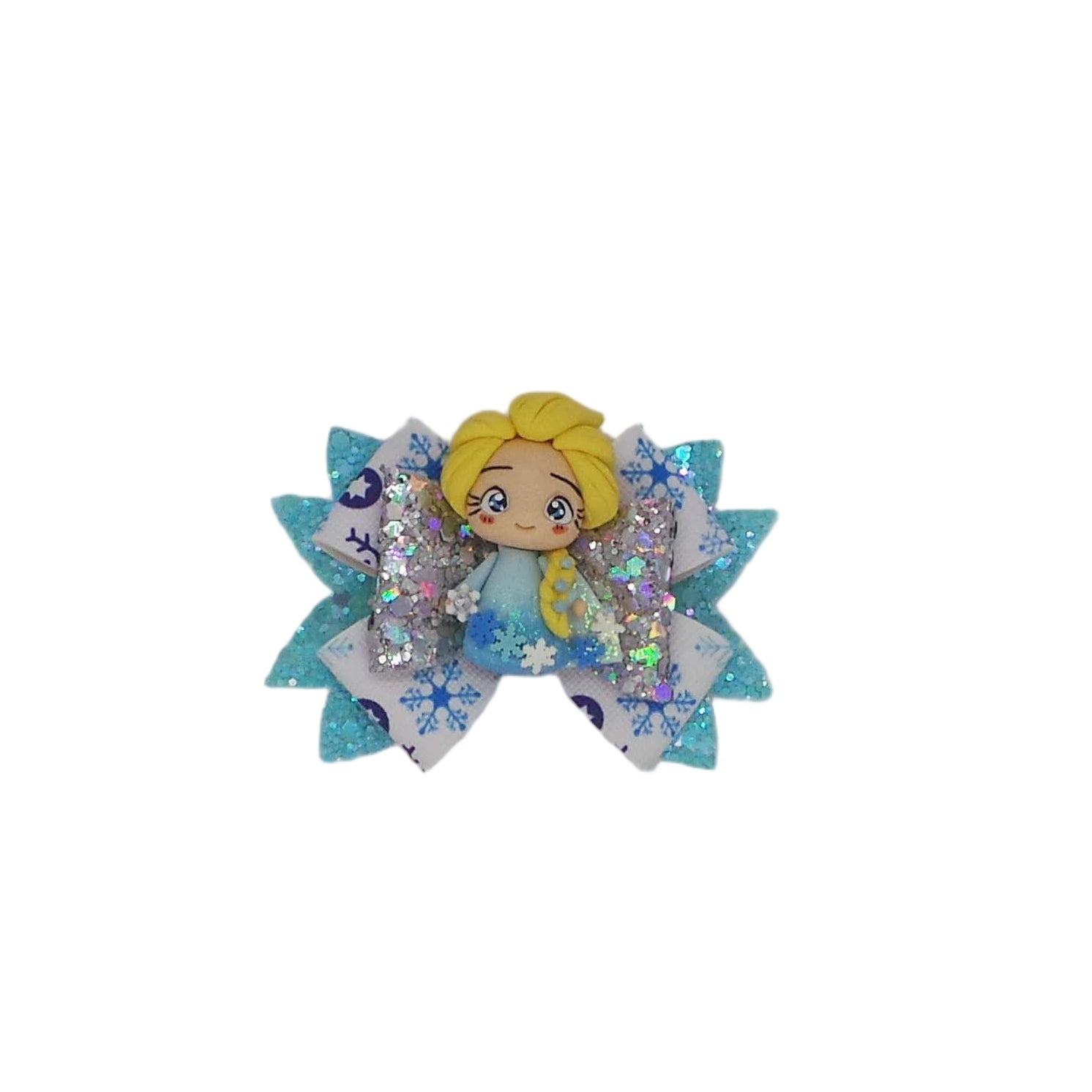 An ice queen with snowflakes clay attached to chunky glitter and printed faux leather sheets.