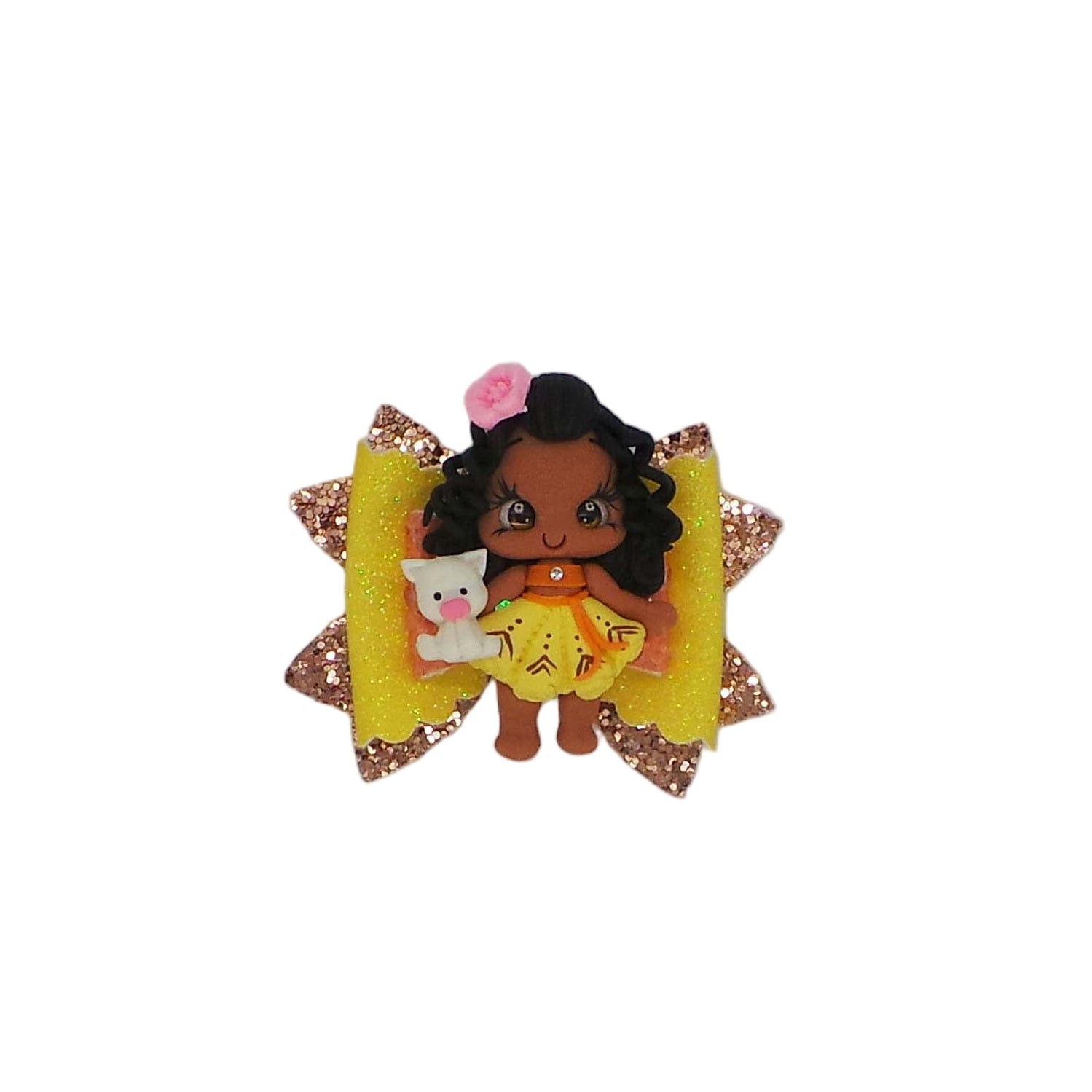 An island princess clay attached to chunky glitter and printed faux leather sheets.