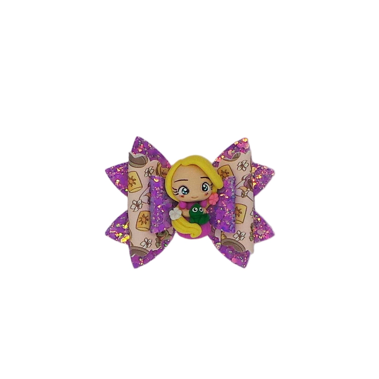 A Lantern Princess clay attached to chunky glitter and printed faux leather sheets.