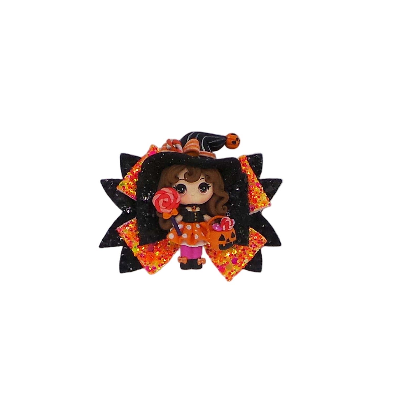 A cute orange witch clay attached to chunky glitter and printed faux leather sheets.