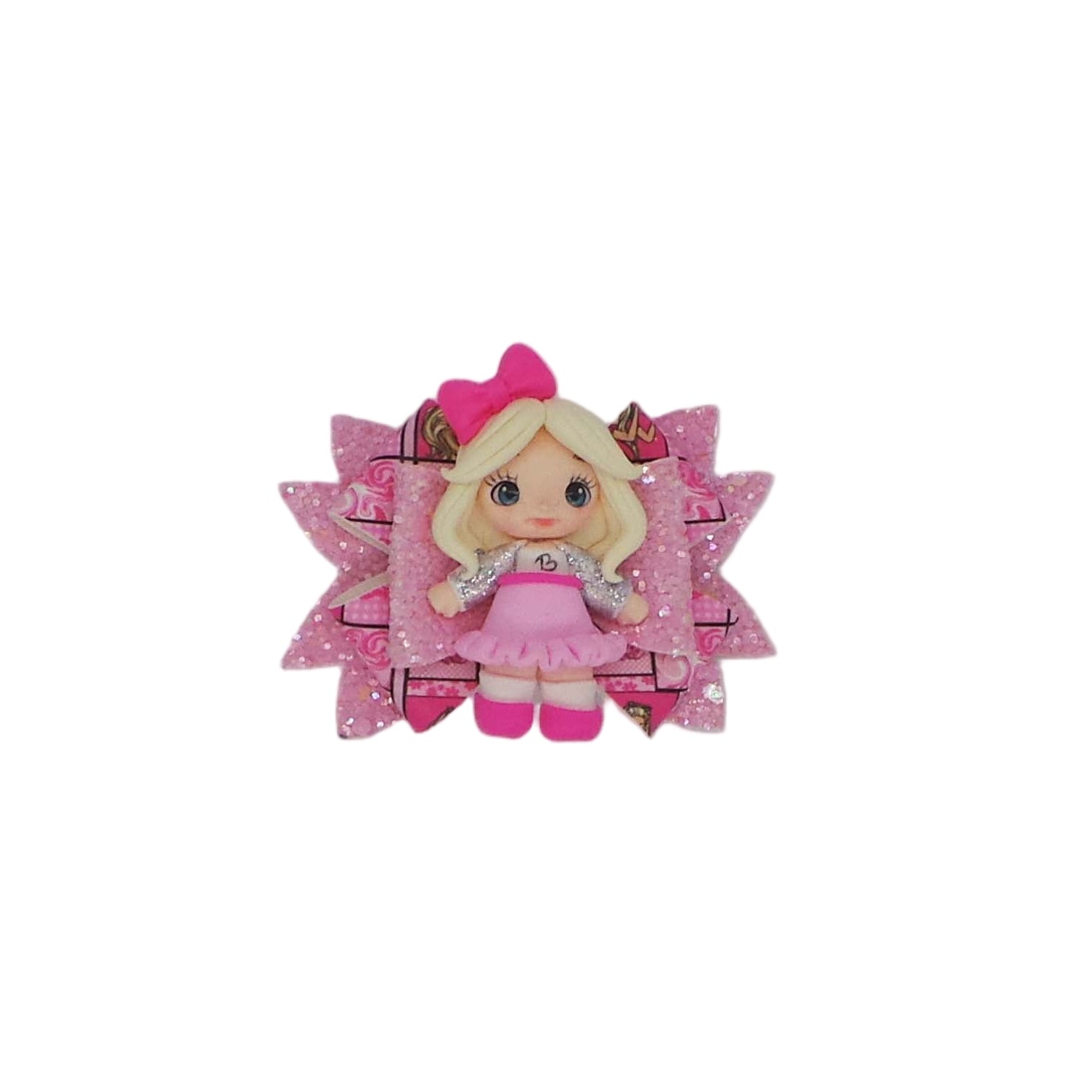 A plastic girl clay attached to chunky glitter and printed faux leather sheets.