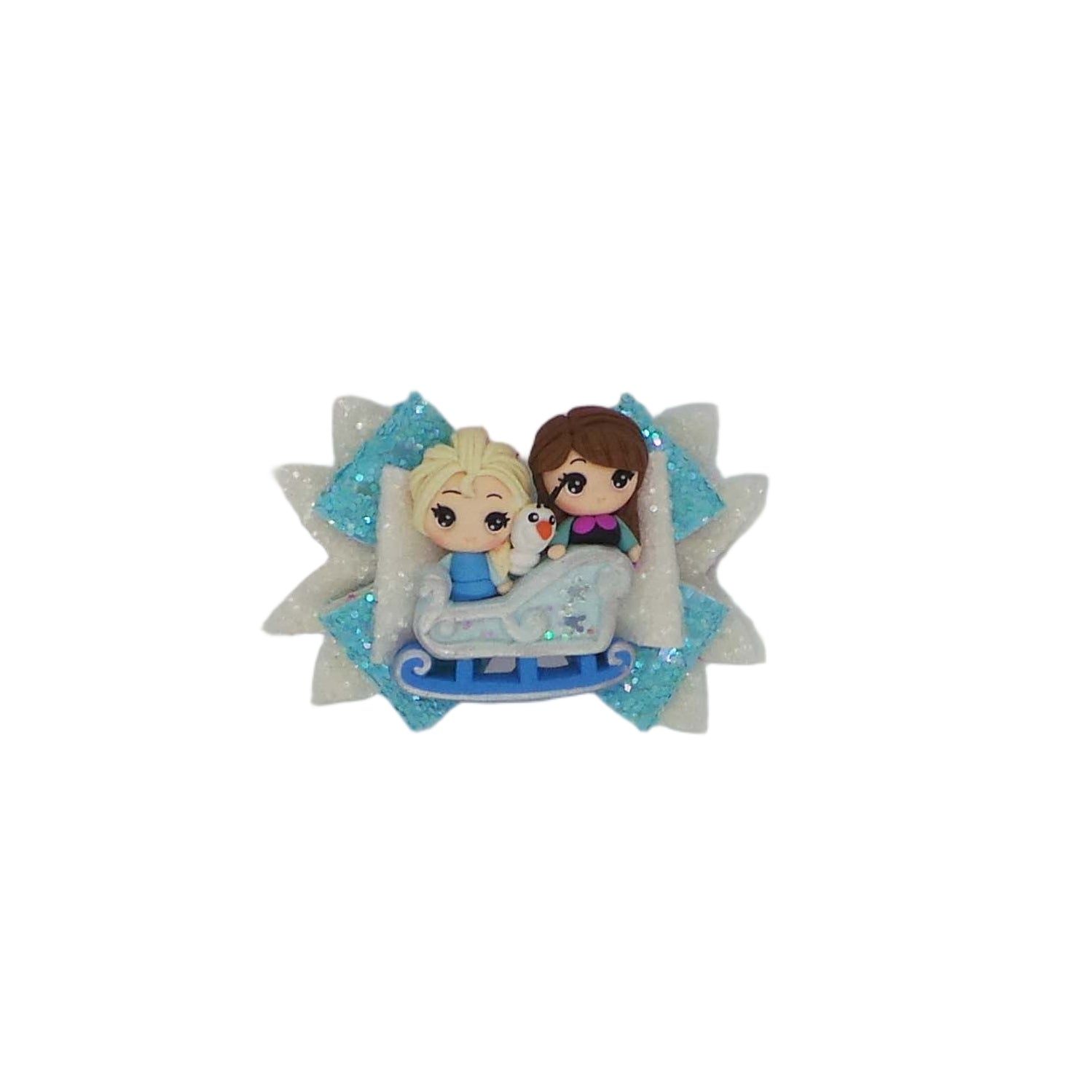 A snow sister rides clay attached to chunky glitter and printed faux leather sheets.