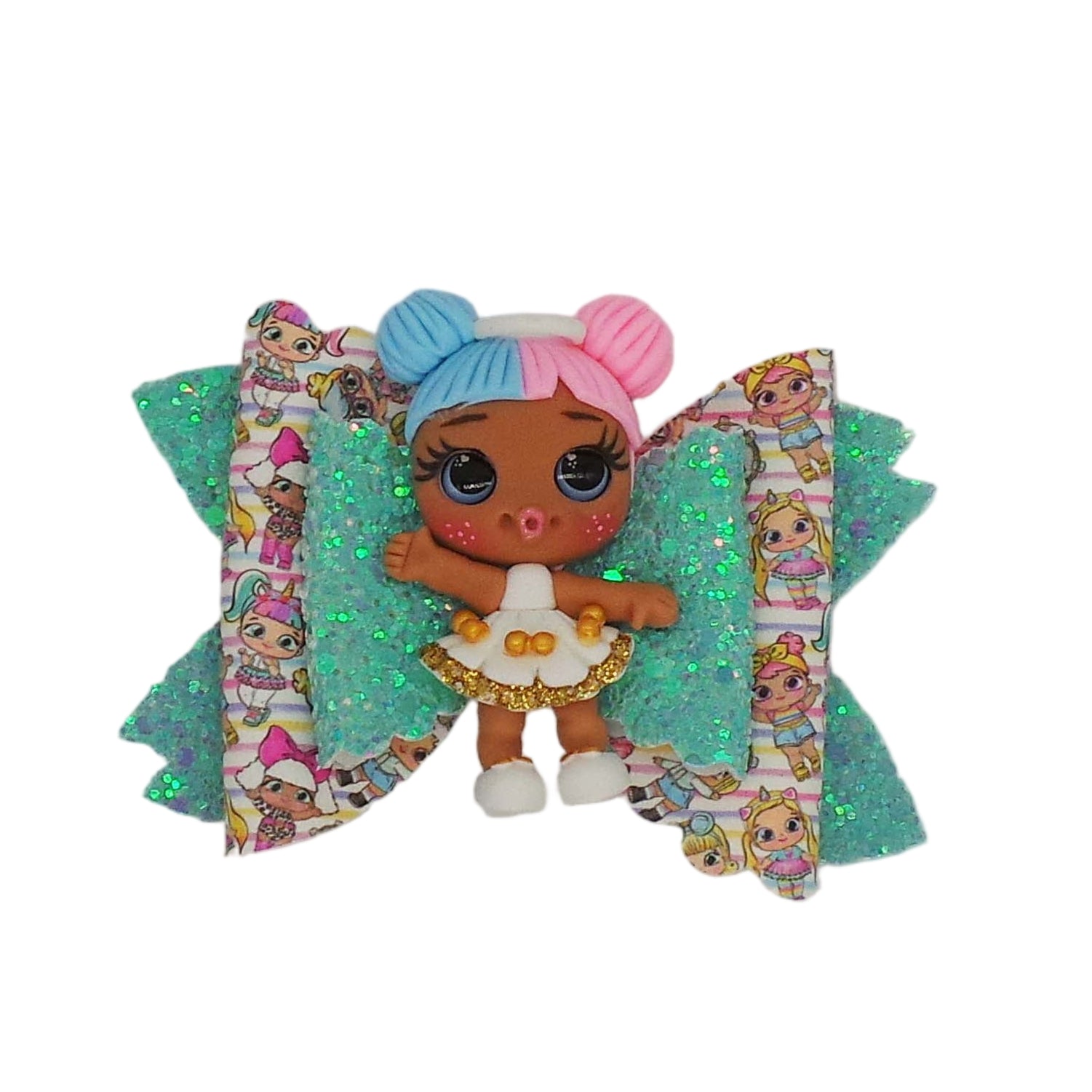 A cute LOL clay attached to chunky glitter and plain faux leather.