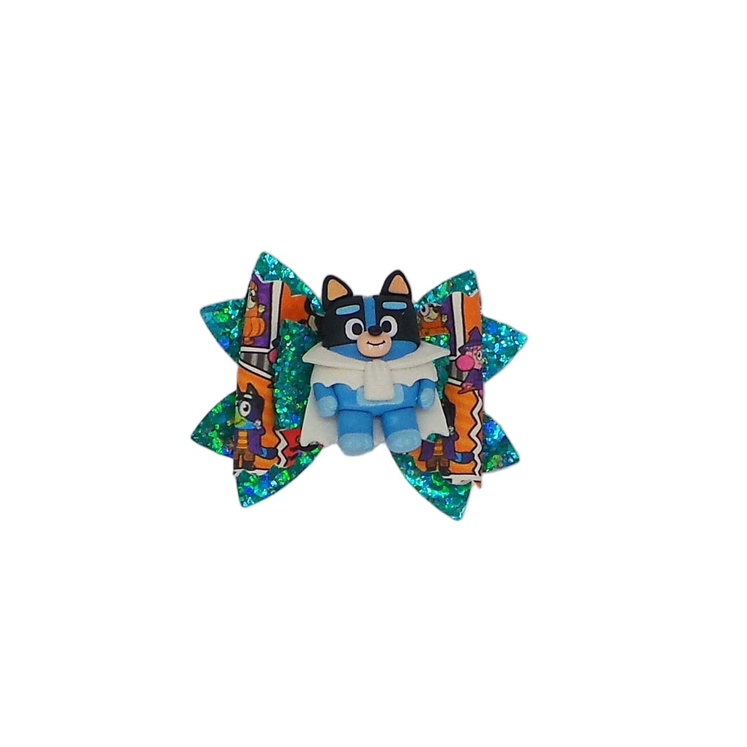 A cute vampire Heeler clay attached to chunky glitter and printed faux leather sheets.
