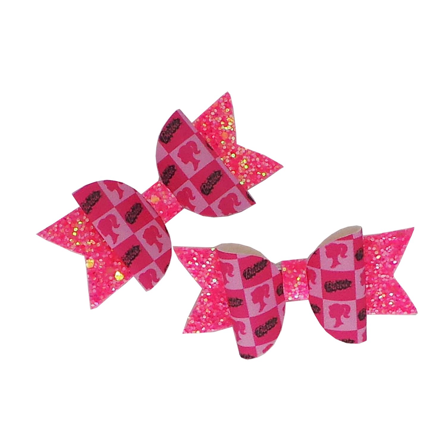 A 2 Pack Barbie Set of bows made from a mix of chunky glitter and printed faux leather sheets.