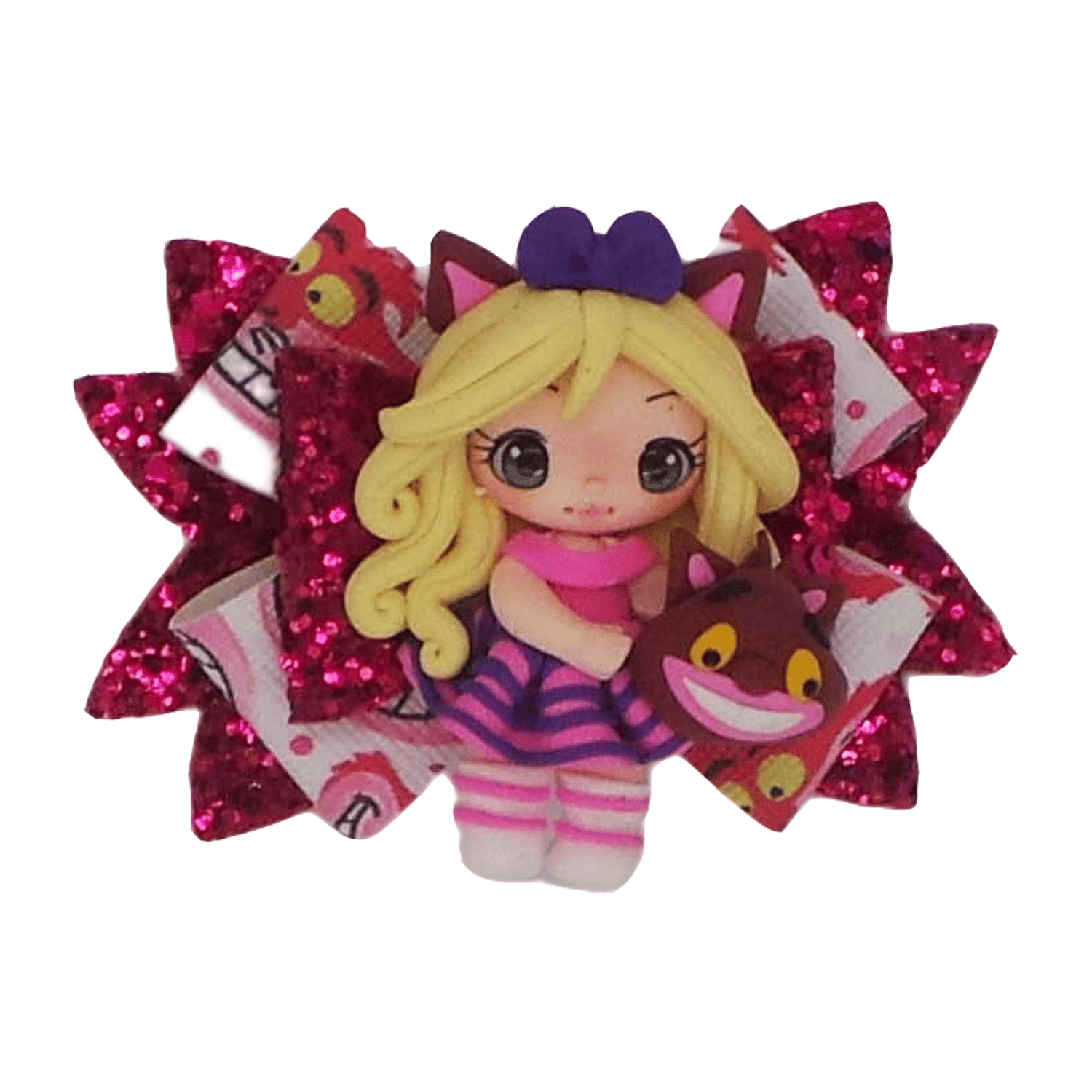 Alice Cat bow clay attached to funky printed faux leather and chunky glitter faux leather.