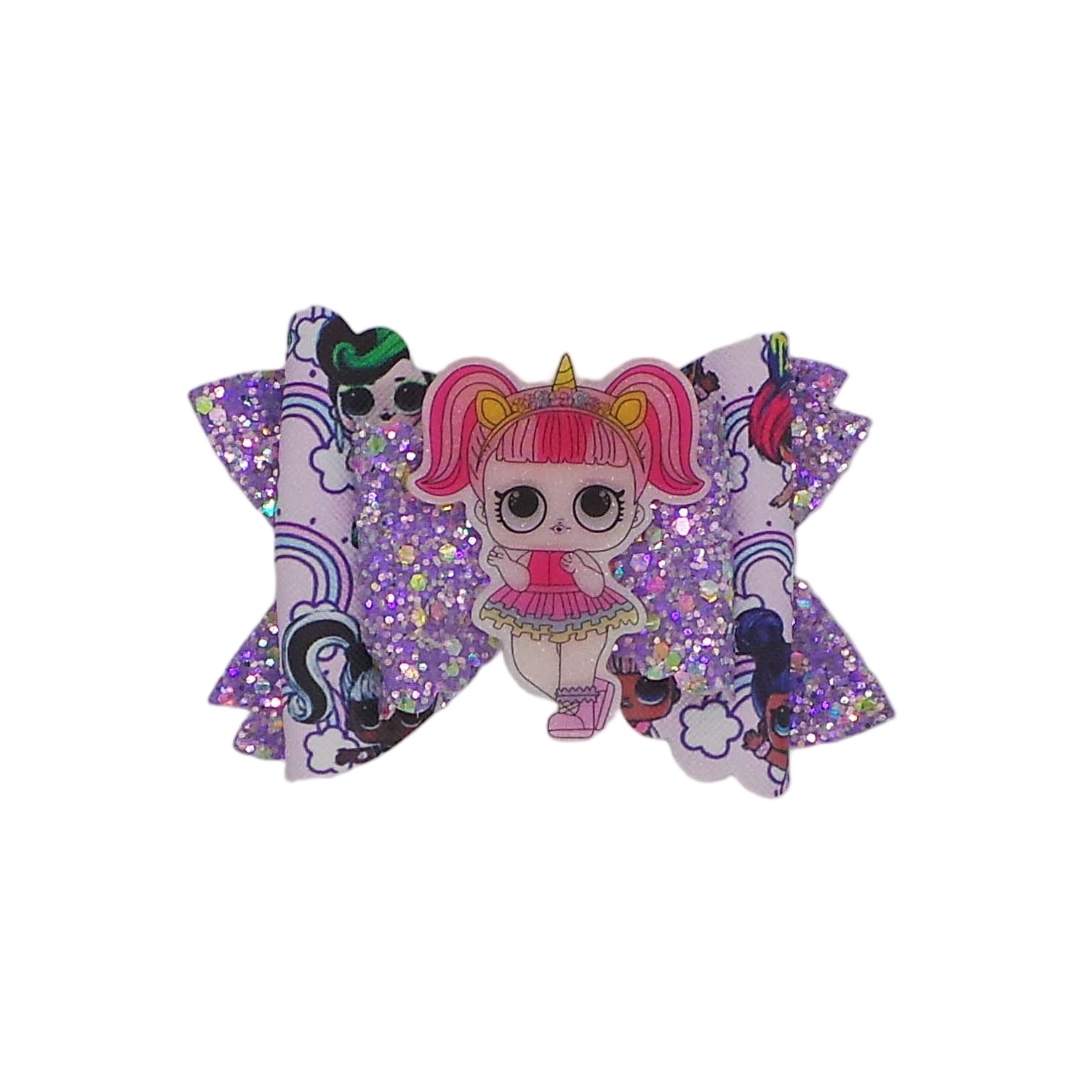 Big LOL Unicorn Bow is made from funky printed faux leather and chunky glitter faux leather with a small acrylic embellishment attached.