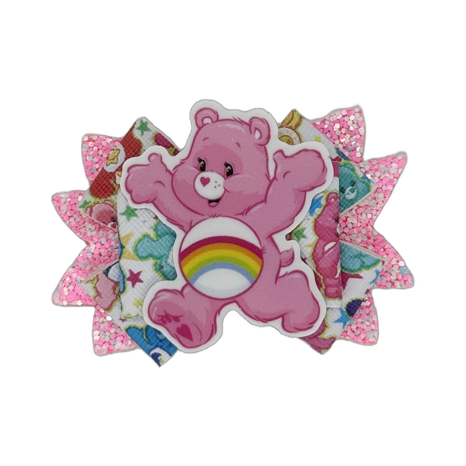 Pink Carebear Embellishment bow is made from printed and chunky glitter faux leather with a flat resin embellishment attached.