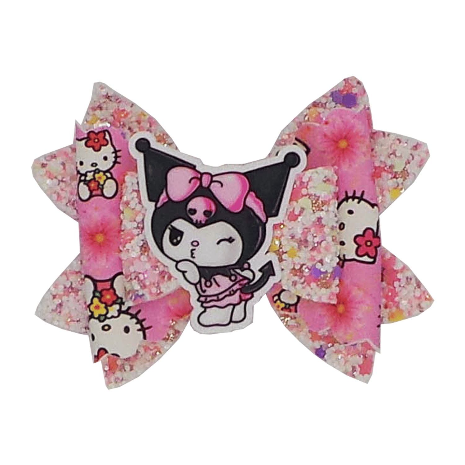Pink Kitty Friend bows are made from funky printed faux leather and chunky glitter faux leather with a flat resin embellishment attached.