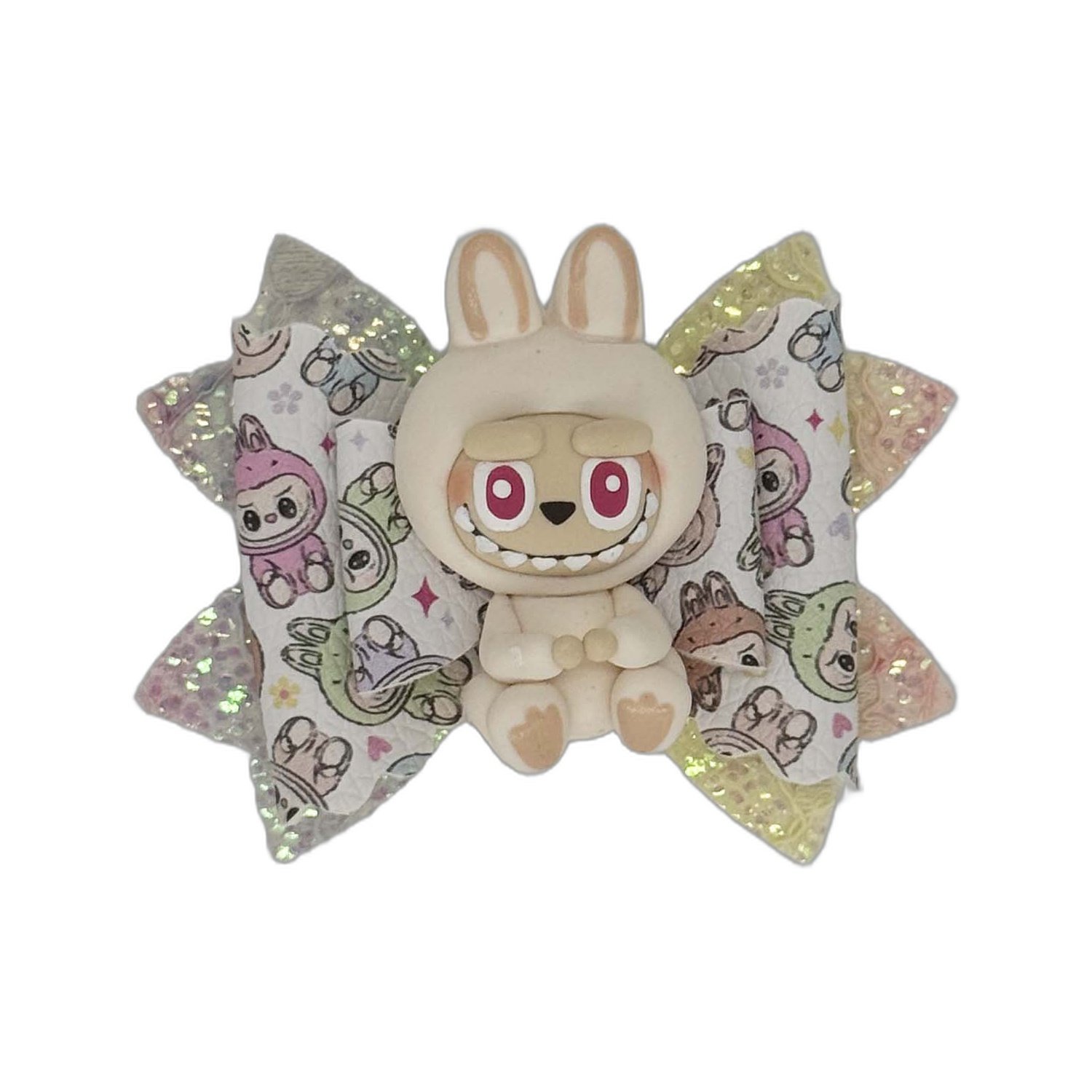 White Labubu clay attached to funky printed faux leather and chunky glitter faux leather.